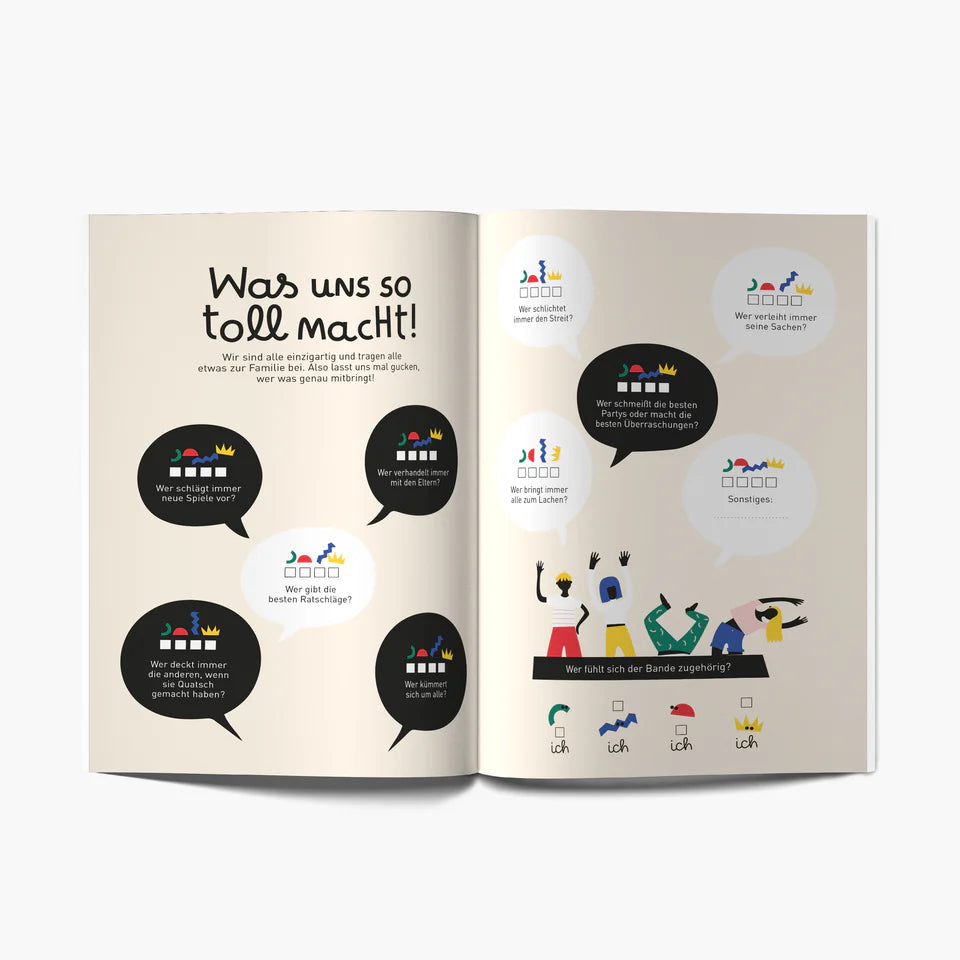 Dieses Buch lädt euch dazu ein, es gemeinsam auszufüllen – um euch über eure Unterschiede zu wundern, eure Eltern ein bisschen in den Wahnsinn zu treiben, euch hier und da zu beschweren … und vor allem bewusst zu machen, was jede*r Einzelne zum Familien-Stamm beiträgt.